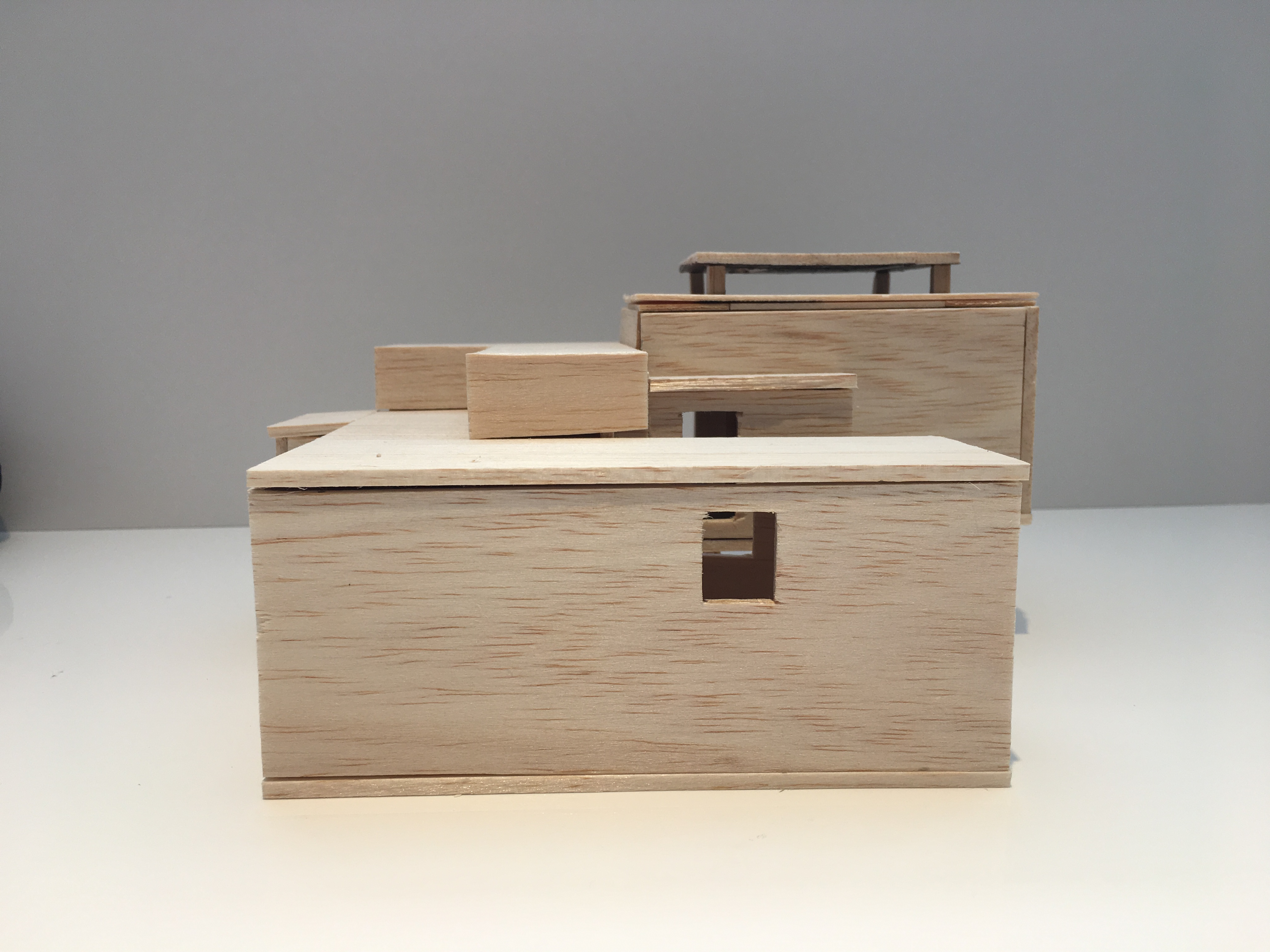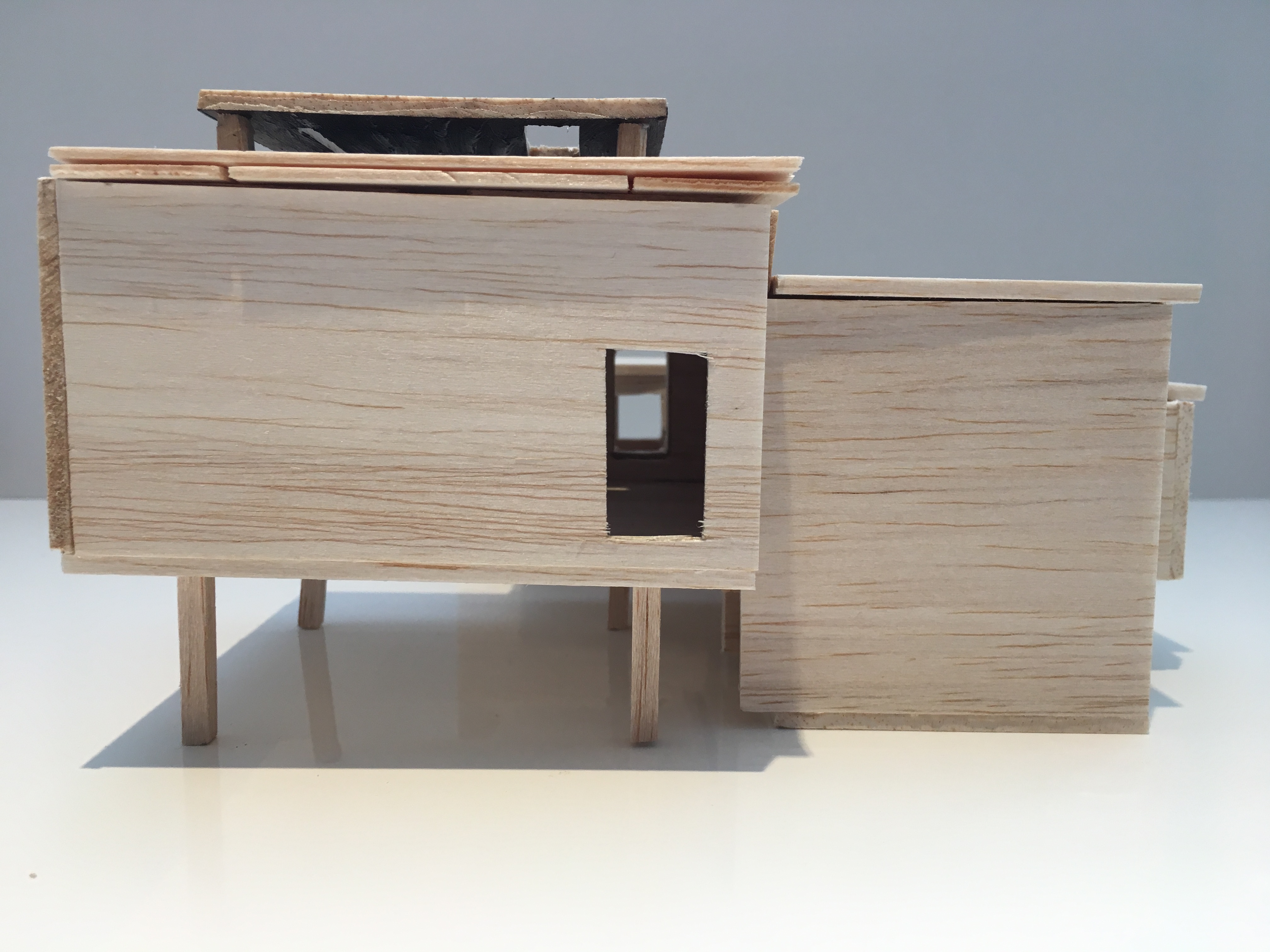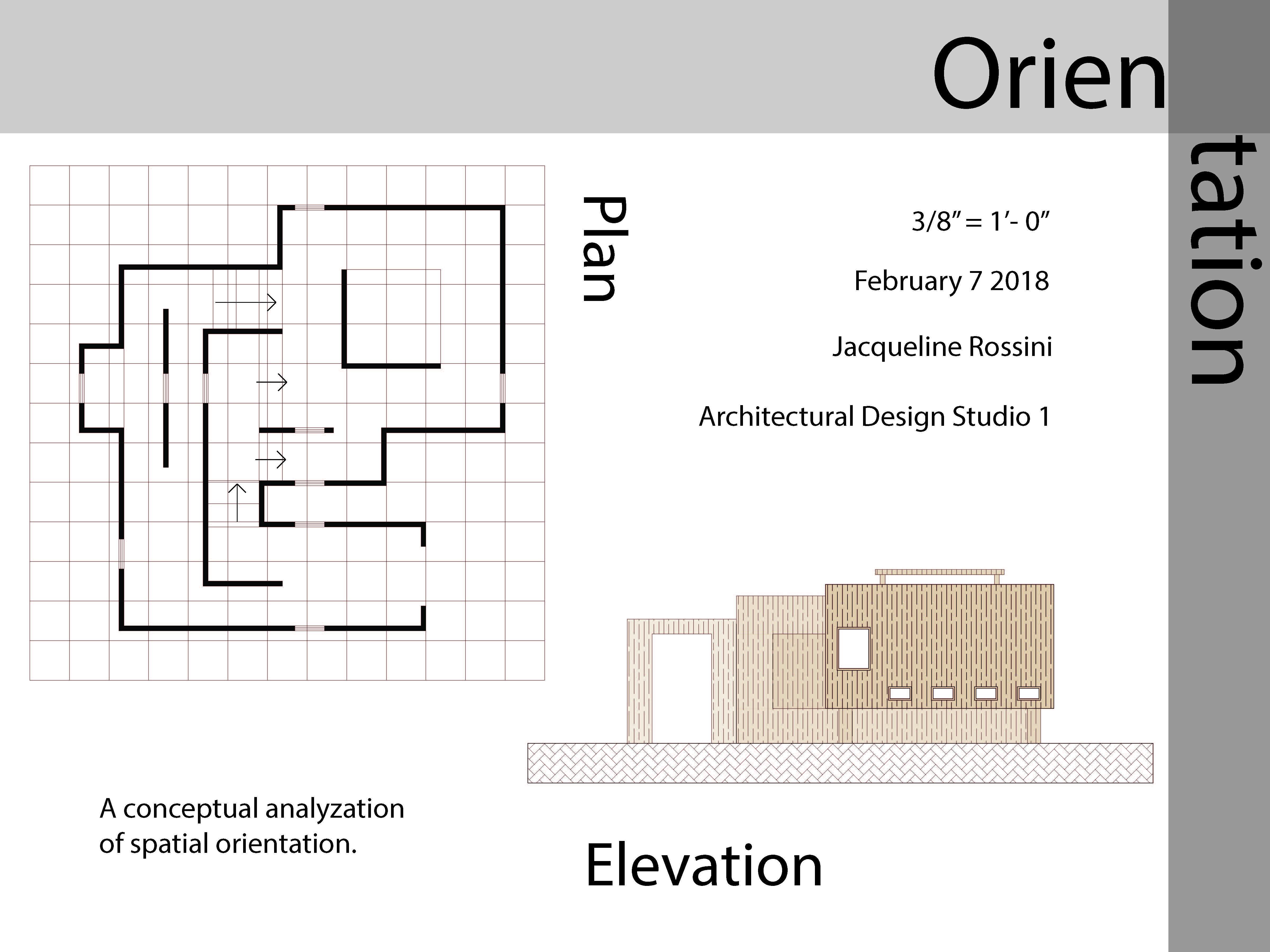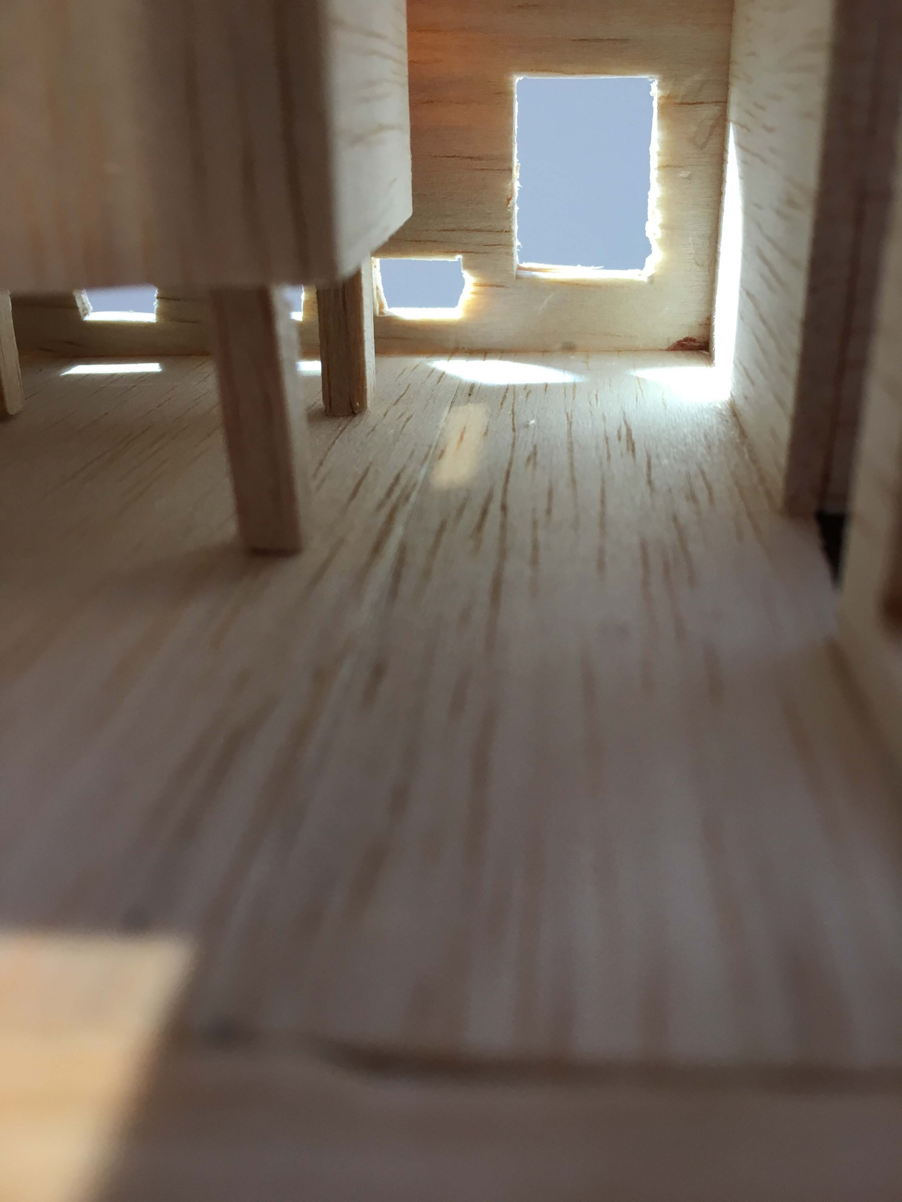 The space, Orientation, creates an organization of spaces, which force the person to interact with it. Small walkways cause a person to interact individually, with only space for one person at a time while walking. In shared areas there is enough space to stand, lay down, and sit with multiple people. The entrance causes individuals to interact in two ways through different experiences while both entering and exiting. Orientation creates a space for both adults and children to interact differently. A crawling space can be used by children, as well as thin wall spaces forcing adults to turn sideways to pass through, while children can walk straight through. Two lines of windows perpendicular to each other pass through the entire structure creating vistas, where individuals can see from one side of the pavilion to the other.