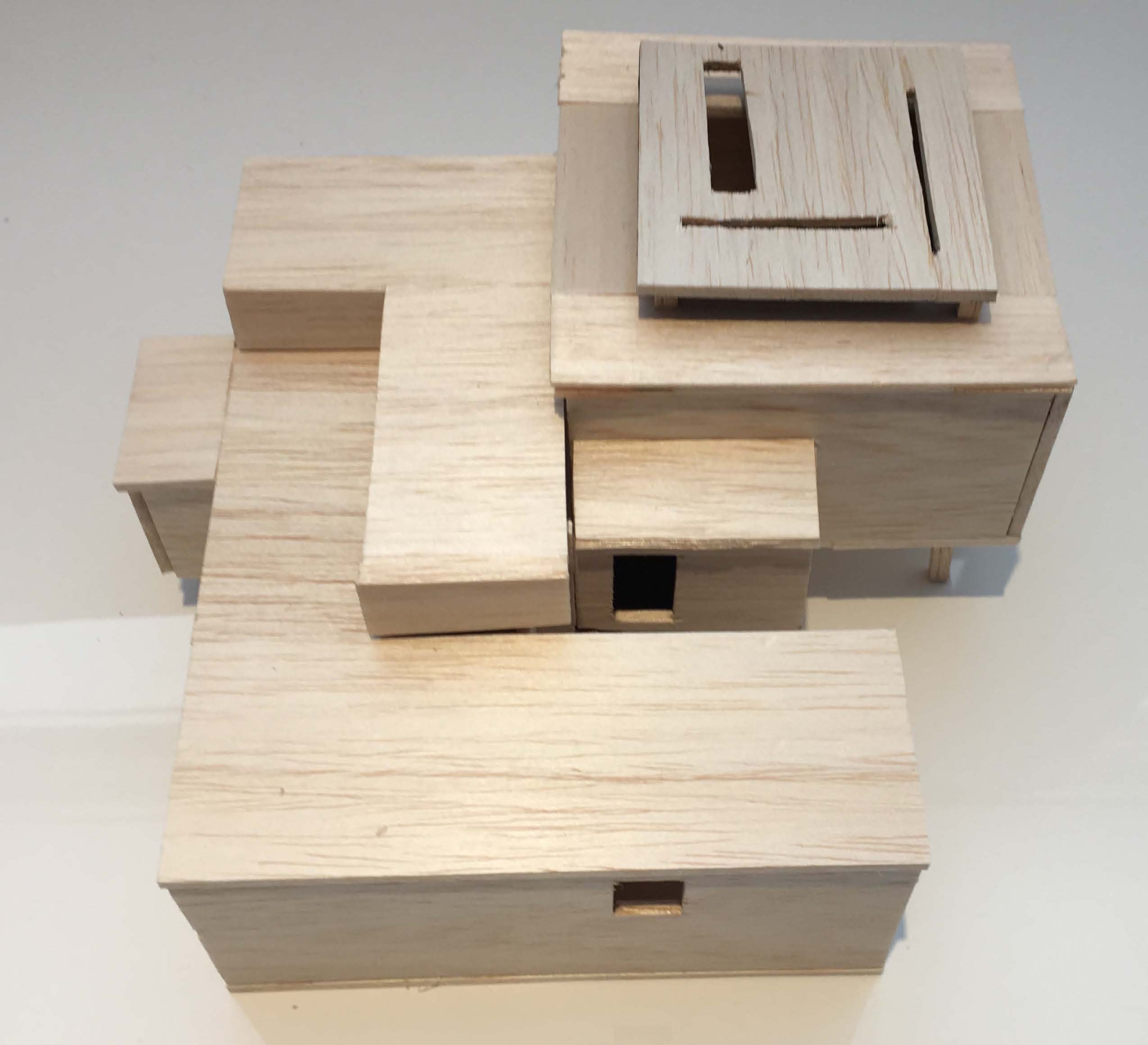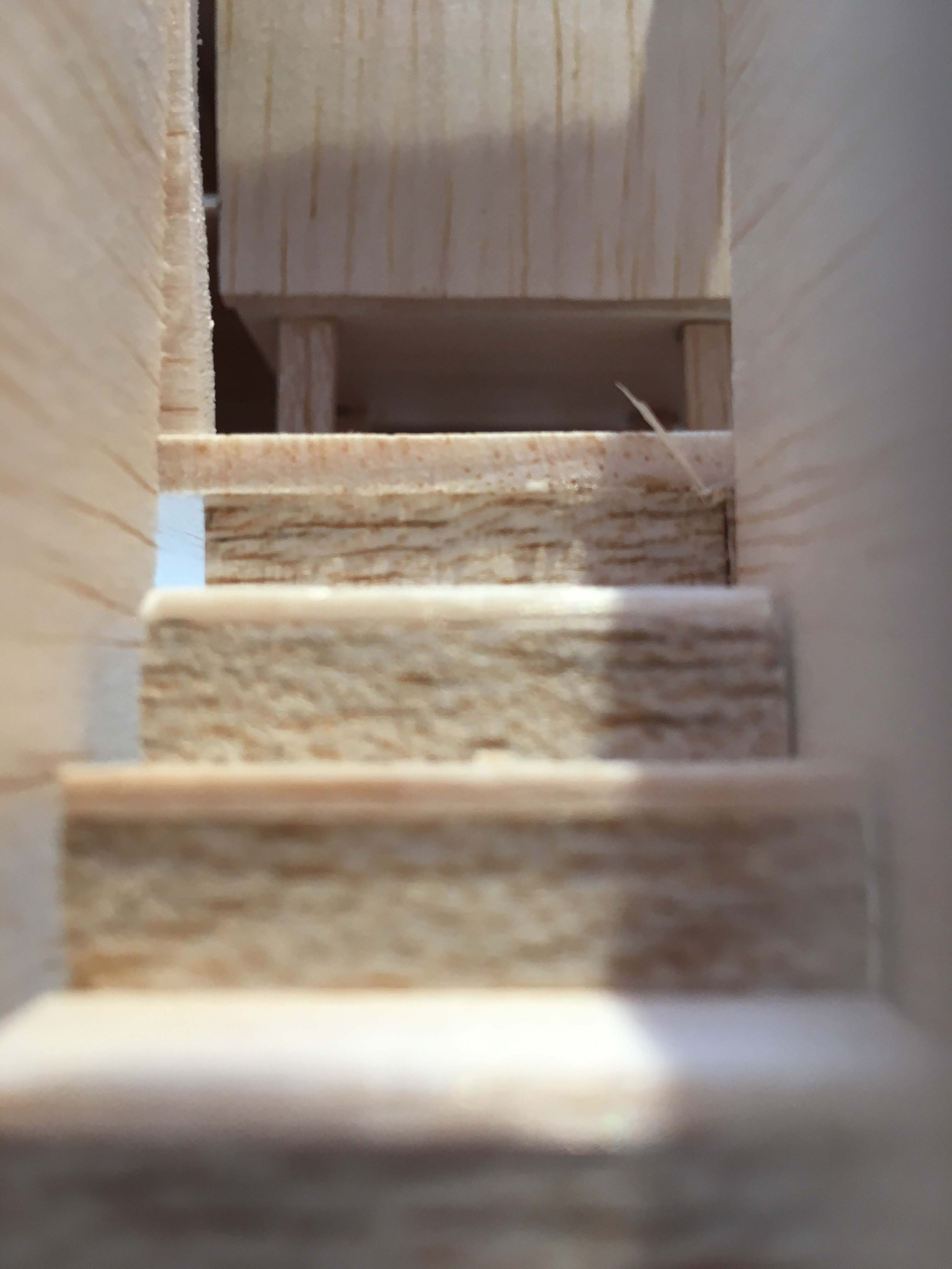 Two materials are used within the structure, light and dark wood. The contrast shows the light wood throughout, whereas the dark wood indicated the spaces in which to intentionally interact with the structure. The darker wood shows the option for individuals to pause within the space, whereas the light wood becomes the unintentional interaction with the individual.